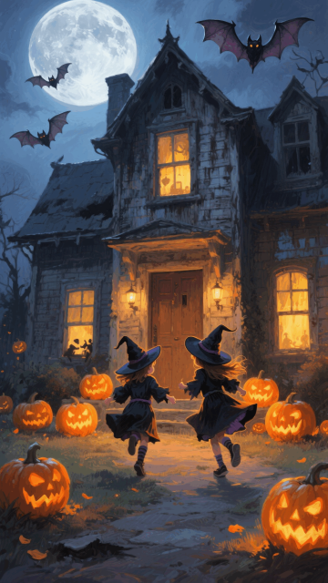 哥特风格老屋前,两个小女巫手牵手奔出,南瓜灯与满月交织出梦幻神秘的万圣夜,插画风厚涂手法营造温暖光影,故事感十足。