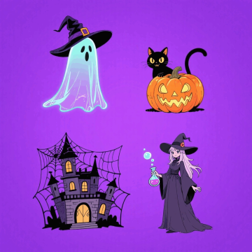 软3D风格的万圣节萌物,拟人化小鬼、南瓜、猫咪与幽灵,毛发生长质感细腻,梦幻紫色背景营造可爱又神秘的节日氛围。