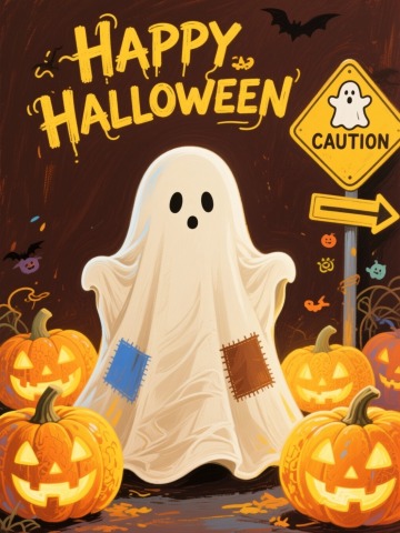 插画风结合描边风,大字设计突出“Spooky But!”,搭配卡通鬼魂与蝙蝠,营造趣味与神秘交织的万圣节氛围,哥特元素点缀,印刷质感强化视觉冲击。