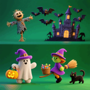 软3D风格的万圣节场景,融合可爱感与梦幻感,拟人化角色如小巫师、幽灵、稻草人与黑猫,搭配粘土质感与卡通风设计,营造温馨童趣的节日氛围。