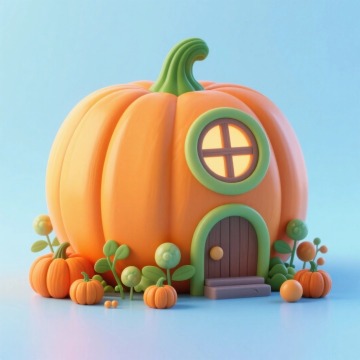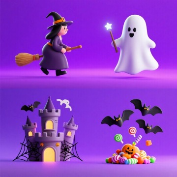 梦幻紫色城堡,软3D粘土风,萌趣南瓜灯与小幽灵环绕,卡通感十足,营造温馨可爱的万圣节氛围。