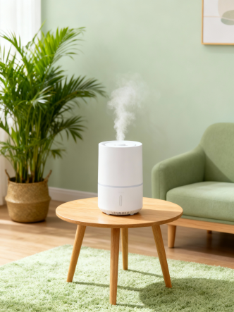 清新绿意环绕,简约白色加湿器轻雾袅袅,融合性冷淡风与轻拟物设计,营造舒适柔和的居家实景感。