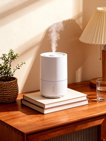 简约主义风格,性冷淡风设计,轻拟物形态的加湿器置于木质床头柜上,柔和光线营造舒适温馨实景感,蒸汽轻盈升腾,传递宁静生活氛围。