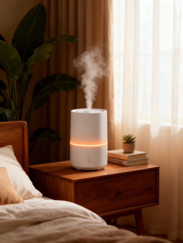 暖光轻雾萦绕,木雕风床头柜上简约加湿器静置,柔光透帘,营造冬日温馨实景感,轻拟物设计呼应自然舒适。