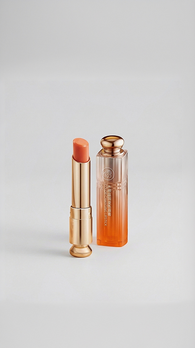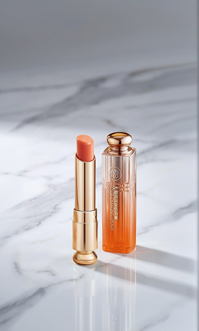 以暖黄为主色调,搭配口红的粉调、瓶身的金棕与花枝的浅黄,营造出温暖、优雅且精致的氛围,尽显美妆品的魅力。详情