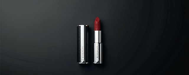暗红色背景,产品后方搭配大面积口红涂抹痕迹,柔美的流体,侧上方硬光打亮,凸显金属高光、膏体色泽详情