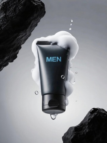 超写实电商产品图,被形态各异的透明水珠、水簇环绕,部分水珠附着产品表面。背景为低饱和渐变底色,冷调光源从侧下方照射,凸显产品科技感与成分专业性。材质表现哑光细腻,色彩搭配以主体色彩为主,色调柔和高级,构图采用轻微倾斜角度,动态元素环绕主体,含品牌 logo