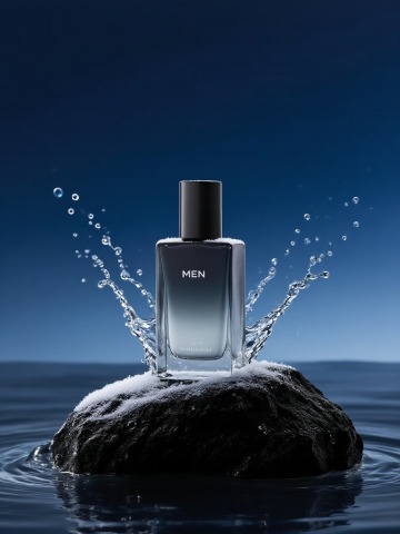 清新玻璃瓶置于虚拟自然水景中,花影轻舞,尽显清爽与清透感。