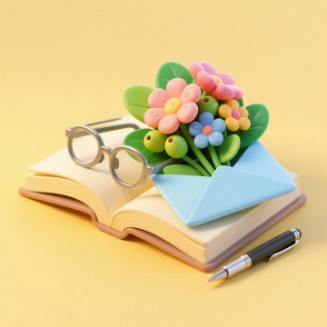 3D轻拟物风设计,信封中绽放清新花束,搭配书本与眼镜,营造温馨阅读氛围。