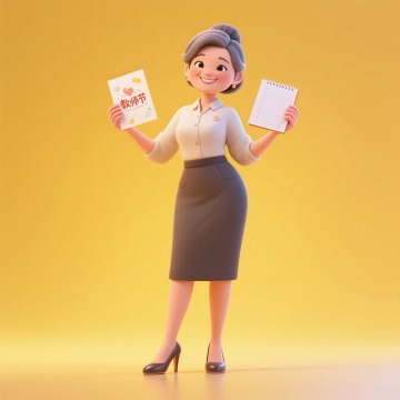 软3D风格教师形象,卡通感十足,融合温馨与商务气质,手持教师节贺卡与书本,展现轻拟物设计,突出节日氛围与可爱体积感。