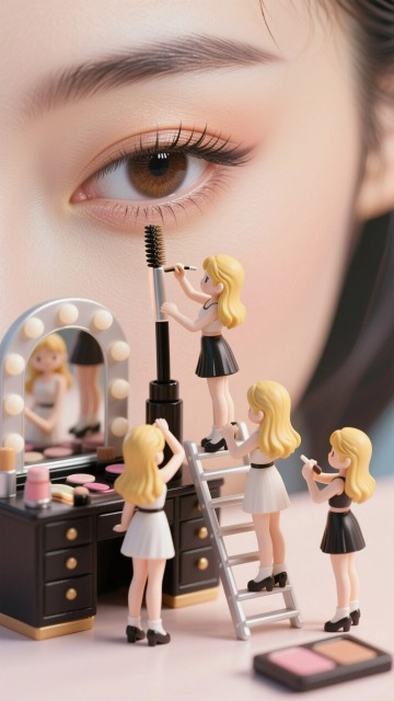 微缩艺术风结合拟人化小人,以超现实主义手法呈现睫毛膏涂抹场景,3D质感光影细腻,趣味十足,充满节日创意惊喜。