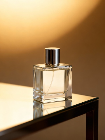 鎏金风与玻璃风交融,金属瓶盖折射柔和光影,干花飘浮于琥珀色背景,营造奢华优雅的唯美感,重拟物手法强化质感与实景感。