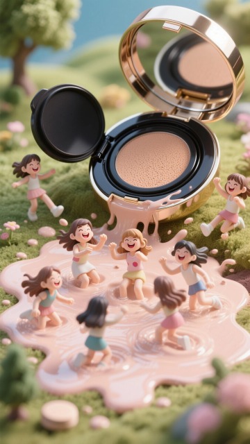 梦幻感与甜美感交织的微缩艺术风场景,3D卡通人物环绕城堡式眼影盘,镜中浮现大眼,粒子飘散如星河,重拟物设计搭配粘土质感,营造虚拟现实般的童话氛围。