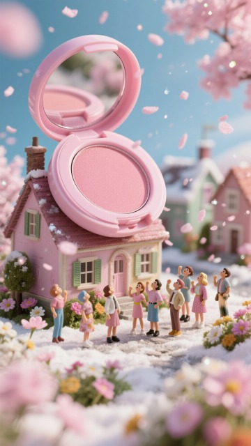 微缩艺术风结合拟人化小人,以超现实主义手法呈现睫毛膏涂抹场景,3D质感光影细腻,趣味十足,充满节日创意惊喜。