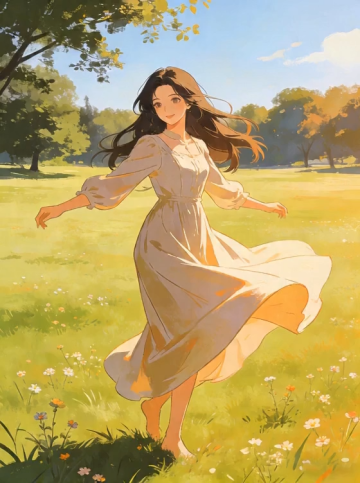 清新唯美的动漫风插画,水彩质感光影交织,少女在春日花野中轻盈奔跑,洋溢文艺气息。
