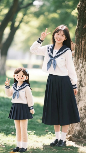 清新实景与动漫微缩艺术结合,少女校服造型,海边铁轨旁的青春记忆。