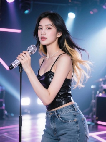 时尚潮流插画风,歌手舞台魅力尽显,漫画手法演绎现代感。