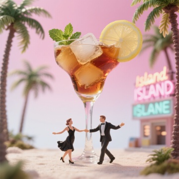 3D微缩艺术风,极繁主义设计,清新柠檬饮在沙滩上,充满夏日清爽感。