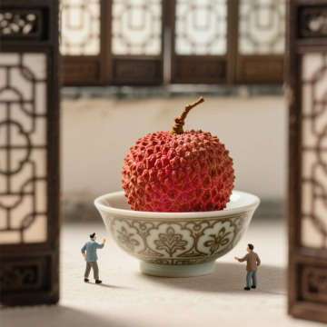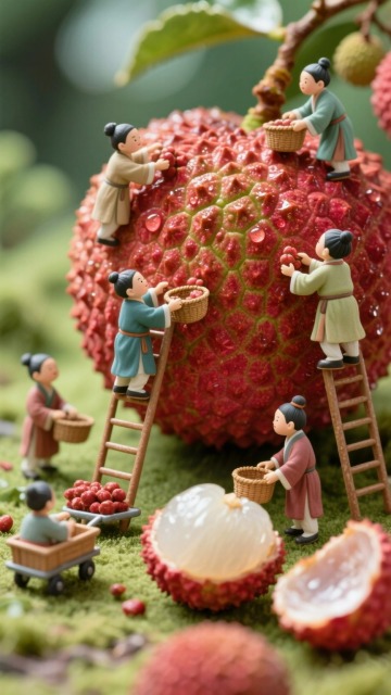 微缩艺术风结合中式感,以重拟物与浮雕手法呈现荔枝丰收场景,国潮元素融入趣味叙事,实景感十足,传递夏日节庆的鲜活气息。