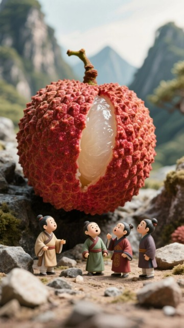 工笔风融合国潮美学,以重拟物手法呈现荔枝与仙侠人物,水墨意境中透出刺绣质感,古典优雅间流淌梦幻唯美之韵。