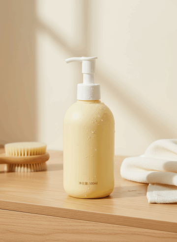 高清摄影风格的洗发水产品海报,柔和的米黄色背景营造出温馨自然的氛围,中央放置一瓶透明瓶身、黑色按压泵头的洗发水,瓶内是淡黄色液体,瓶身印有简洁的品牌文字,置于天然质感的浅棕色岩石上,岩石旁点缀一朵白色盛开的鲜花和几片绿色叶子,背景中两侧摆放着带有绿色植物的陶土花盆,光线从左上方柔和照射,形成细腻的阴影和高光,整体色调统一为温暖的米色、棕色和绿色,构图采用对称与平衡的布局,突出产品的自然纯净感,传达出沐浴在自然花香中的舒适体验。