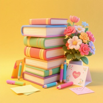一系列6个不同造型的卡通风格书籍与铅笔组合插画,保持圆润可爱的3D立体造型、明亮柔和的光影效果、光滑渐变的材质质感,每幅均为纯色背景且整体色彩完全不同,元素内容包含一本翻开的橙色封面书籍叠放在一本粉色封面书籍上、一支带有粉色笔帽和蓝色笔身的铅笔斜靠在翻开的书页上,6个造型在保持核心元素不变的前提下进行铅笔摆放角度、书籍翻开幅度或书页卷曲细节的变化,所有插画规整排布形成集合,画面简洁明快,无文字信息