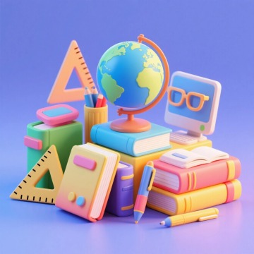 6个不同配色、不同样式、不同材质的教育元素(如书本、铅笔、地球仪、放大镜、计算器、文件夹等),每个元素具有清晰的3D立体效果,表面光滑有光泽,带有细腻的高光和柔和阴影,白色背景,元素排列整齐有序,呈现出简洁、专业的教育主题氛围。