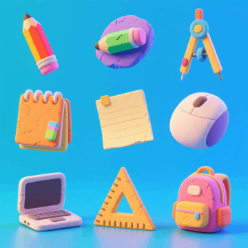 一套6个完全不同的文具元素集合,采用圆润可爱的3D立体风格,柔和渐变色彩,每个元素均有清晰的高光和阴影,底部带有轻微投影,整体呈规整网格排布在纯色背景上。包含粉色笔帽黄色笔身的铅笔斜放在黄色封面蓝色线圈的笔记本上、蓝色橡皮擦拭去灰色铅笔字迹的场景、橙色削笔刀正在削绿色铅笔的动态瞬间、紫色尺子与黄色量角器交叉摆放、红色胶棒斜靠在白色便签纸上、绿色剪刀剪切彩色纸条的画面,所有文具均保持统一的卡通化造型和明亮愉悦的色彩搭配,展现出一致的可爱文具主题和视觉风格。