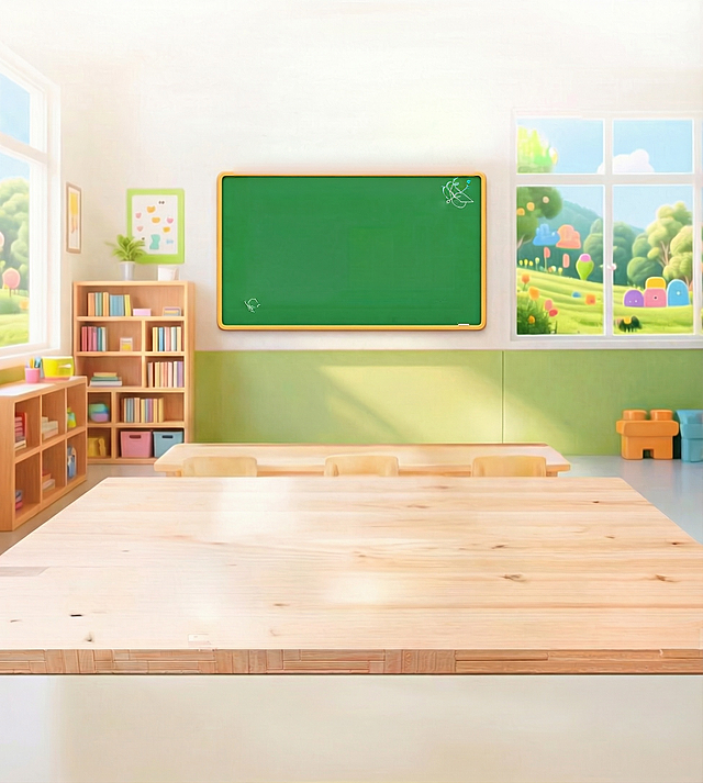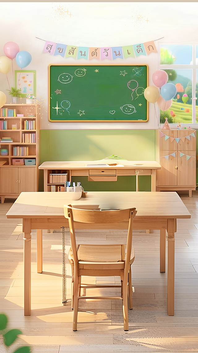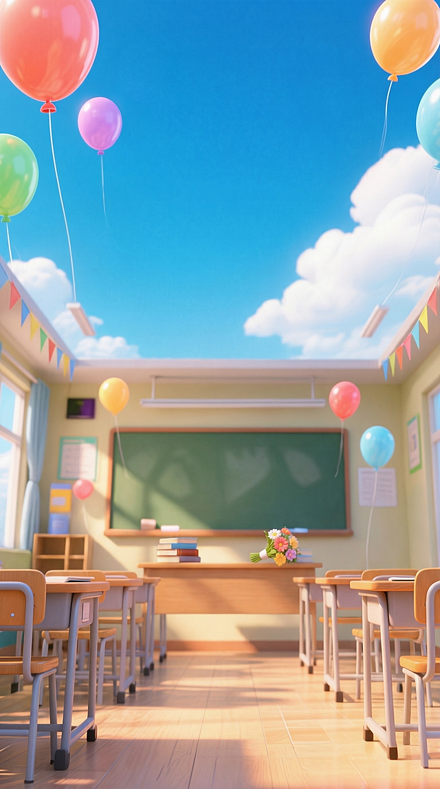 尺寸为1080X1920,,画面整体为鲜艳明亮的暖色调,背景为的教室内景(三分之二可见黑板,三分之一为窗户,窗外是阳光明媚的校园风景,不要出现天花板),前景是课桌(桌面纹理清晰,无遮挡),聚焦在前景课桌上,画面重心居下详情
