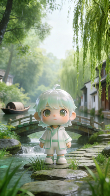 中式卡通3D风,拟人兔子伴佳人,梦幻甜美自拍桥畔。