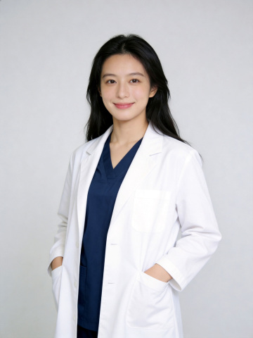 一位亚洲女性医生的证件照,她穿着洁白挺括的医生白大褂,内搭浅蓝色衬衫,双臂自然交叉于胸前。她的头发梳理得整洁利落,露出光洁的额头和温和的面容,嘴角带着亲切自然的微笑,眼神明亮有神,充满专业与亲和力。背景为纯白色,光线均匀柔和,突出人物主体,整体画面简洁干净、专业正式,符合证件照的规范和职业形象。