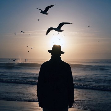 剪影风插画,夕阳海面光影交织,人物奔跑剪影洋溢温馨浪漫,水彩质感与印象派笔触融合,梦幻氛围满溢。