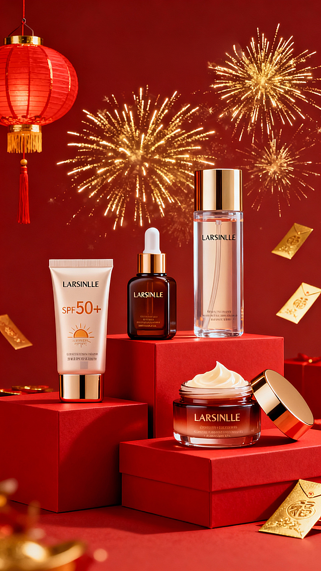 - 展示了四款明星产品: - **防晒霜**(SPF50+):适合新年出行或日常防护。 - **精华液/原液瓶**:深棕色瓶身,滴管设计,高端感十足。 - **爽肤水/化妆水**:透明瓶身,清新简约。 - **面霜/乳霜**:打开盖子,露出丰润质地,强调保湿滋养。 - 产品陈列在红色礼盒之上,营造出“送礼佳品”或“自用犒赏”的感觉,符合春节送礼和自我宠爱的消费心理。 #### 4. **视觉设计亮点** - **主色调为中国红 + 金色烟花**:充满节日喜庆感,吸引眼球。 - **灯笼、烟花、红包元素**:强化春节氛围,增强情感共鸣。 - **光影效果与产品质感**:通过细腻的打光和材质表现,突出产品的高级感和专业度。 比例是9:16详情