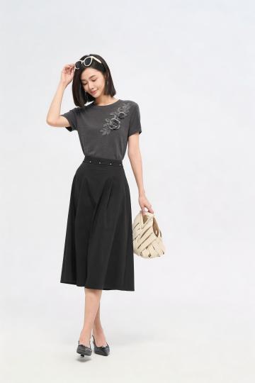 国潮风旗袍,黑灰双色拼接,丝绒与提花面料交织,复古优雅中透出时尚感,经典立领配珍珠扣,尽显中式美学韵味。