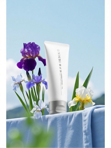 产品为主体,摆放白色石块做层次,把产品放在石块上,周围摆放白花,点缀绿色植物。