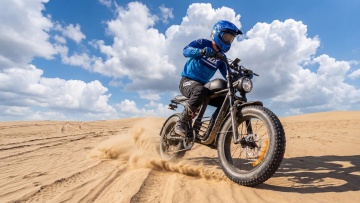 雪域驰骋,实景感与科技感交融,机能风电摩破雪而行,金属质感车身搭配粒子飞溅光影,展现酷炫动感与宽阔视野。