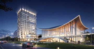 现代商务高楼,玻璃幕墙反射夕阳,3D立体感强,科技氛围浓厚。