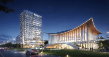 超写实建筑渲染,三座高耸入云的现代玻璃幕墙摩天大楼矗立在城市中心,建筑表面呈现出冷冽的金属光泽与透明玻璃的反光质感,周围环绕着密集的中低层建筑群,整体构图采用大气的城市鸟瞰视角,视角略微仰视以突出高楼的宏伟感,画面边缘有自然的景深模糊效果。主色调为清澈的蔚蓝色天空,点缀着轻薄的白色云层,阳光从斜上方照射,在建筑表面形成明亮的高光与清晰的阴影,营造出晴朗、开阔、充满现代都市活力的氛围。环境改为繁华的都市CBD核心区,高楼林立,道路纵横,展现出高度发达的城市天际线景观,光影效果强调立体感与空间层次,整体风格保持专业级建筑效果图的精细度与真实感。