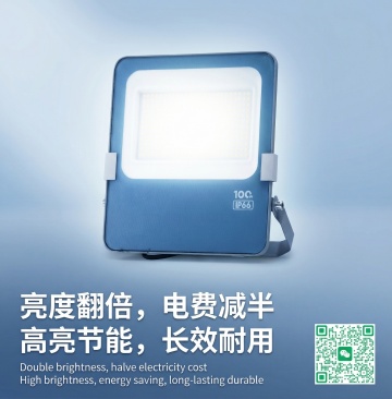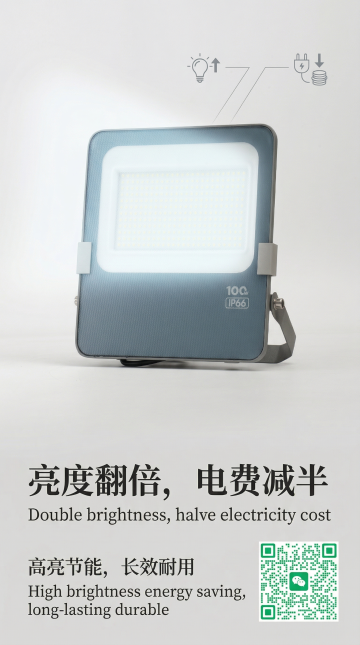 美化这款LED投光灯宣传图,丰富画面细节,添加合适的光影效果与简约科技感背景,不改变原本的产品、微信二维码以及中英文宣传文案“亮度翻倍,电费减半 高亮节能,长效耐用 Double brightness, halve electricity cost High brightness, energy saving, long-lasting durable”的内容,让整体不单调更有商业吸引力