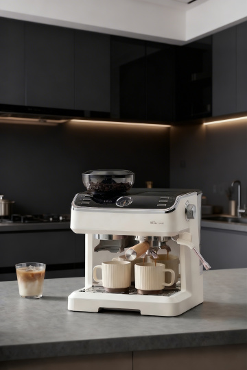 现代感金属风咖啡机,搭配暖黄桌面与绿植光影,融合工业质感与温馨氛围,轻拟物设计展现简约主义美学,传递时尚舒适的生活仪式感。
