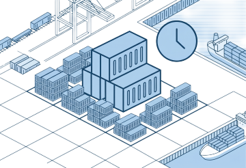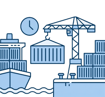 等距视角风格的物流仓库场景插画,蓝色平顶仓库建筑带有灰色屋顶和橙色大门,旁边停放着橙色集装箱卡车,地面上有多个棕色纸箱和橙色、红色集装箱,几名穿着绿色背心的工人正在搬运货物,场景中包含叉车等物流设备,整体采用明亮的蓝、橙、棕配色方案,线条简洁明快,具有清晰的等距投影效果和扁平化设计风格,无文字信息。