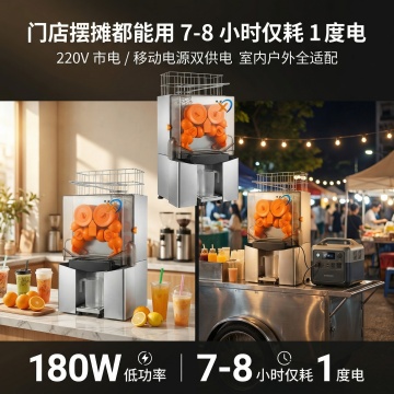 竖版电商详情全场景适配卖点屏,杂志级拼图式精致排版,整体温暖有烟火气的商用场景风格,无冰冷工业感。画面顶部用超粗无衬线字体放置主标题:"全商用场景适配 创业经营全 hold 住",主标题下方放置副标题:"饮品店 / 鲜果店 / 商超 / 自助餐厅 / 夜市摆摊 / 酒店水吧全适用"。画面中间为橙子榨汁机产品全景主图,严格还原上传的产品图所有细节,产品尺寸比例保持1:1,logo保留正确样式,主图周围分6个均等小模块,分别展示产品在饮品店、鲜果店、商超、自助餐厅、夜市摆摊、酒店水吧6个场景的使用效果,每个场景画面清晰统一。整体画面排版规整,风格统一,氛围感强,所有中文文字统一使用无衬线粗体格式。负面提示词:工业风、场景杂乱、产品变形、文字模糊、画面割裂、配色不统一、低像素、logo错误、场景画面模糊