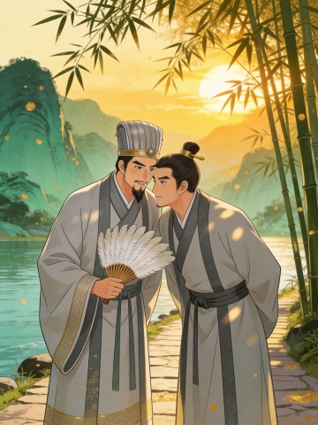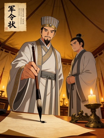 2D国风动漫风格,细腻工笔勾勒人物。暖黄烛光从左侧洒落,营造军帐内的肃穆氛围,屋内灯光布局合理。采用稍微高角度俯拍,突出人物威严。参考之前上传的三张人物图,周瑜端坐主位,保持参考图人物特征,冷峻凌厉地看向诸葛亮的方向,手指轻叩檀木案几,手不能变形;诸葛亮持羽扇立于周瑜对面右侧前景,保持参考图人物特征,从容神色在柔光中愈发温润,衣袂飘然。后方安排几个士兵,士兵的服装不要跟周瑜类似,要有明显区别。画面以青金为主色调,辅以暗红点缀,绢本质感更添古韵。所有人物都不要看向镜头,严格按照参考图人物特征绘制,不得自行更改人物特征