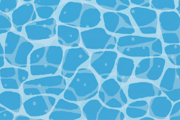 明亮欢快的卡通插画风格夏日清凉泳池水面俯视图,以浅蓝色泳池瓷砖为背景,表面布满波光粼粼的白色水波纹和清晰的网格纹理,营造轻松愉快的夏日氛围。左上角有一个粉白相间的条纹救生圈,带有明显的白色高光和圆形阴影;右上角是一个黄色救生圈,配有蓝色绳结和白色反光条;右下角有一个柠檬黄圆形浮球,表面装饰有闪亮的星形图案。右下角边缘点缀几片绿色棕榈叶,边缘呈锯齿状,增强夏日感。整体构图采用不规则分布,色彩以蓝、黄、粉为主色调,明快和谐,无文字和二维码元素。