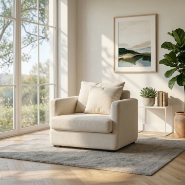 清新自然的极简客厅,柔和光影洒落,米白沙发搭配浅绿针织毯,轻拟物设计与真实质感交织,营造舒适宁静的居家氛围。