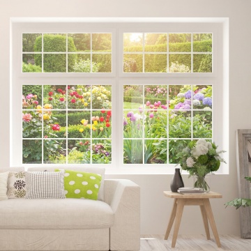 现代简约风格室内场景,不同角度和布置的大窗户,窗外是蓝天白云下的城市与绿色树林景观,窗台上摆放着绿植盆栽、透明玻璃杯和书籍,室内有白色懒人沙发、浅色地毯和木质小桌,温暖的自然光透过窗户洒入,光影柔和,色调以白色、浅木色和自然绿色为主,整体氛围明亮、宁静、舒适,展现不同窗户设计在空间中的布局与采光效果,突出窗景与室内陈设的和谐统一。