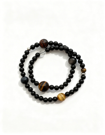 现代感与质朴感交融,黑玛瑙珠链点缀虎眼石,单色设计风中透出轻拟物的自然纹理,金属扣饰增添精致细节,简约优雅。