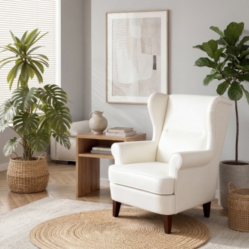 动漫风格插画,明亮自然光从左侧照射,米白色墙面,墙上挂着棕色木质相框的抽象装饰画,画中是米色和棕色的柔和曲线,下方是米白色布艺单人沙发,沙发上放着一个橙色靠垫,沙发左侧有一盆大型绿植,叶片宽大翠绿,放置在白色花盆中,沙发右侧地面上有一个灰色和黑色相间的小型家用电器,浅色地毯铺在人字形拼花木地板上,整体画面温馨舒适,色彩柔和,线条流畅,细节精致,构图平衡。