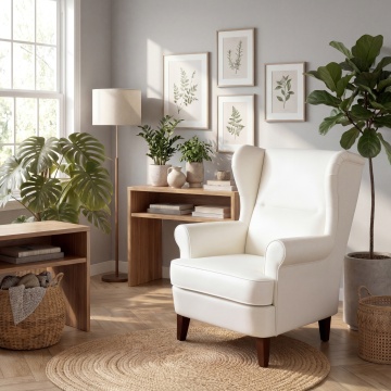 动漫风格插画,明亮自然光从左侧照射,米白色墙面,墙上挂着棕色木质相框的抽象装饰画,画中是米色和棕色的柔和曲线,下方是米白色布艺单人沙发,沙发上放着一个橙色靠垫,沙发左侧有一盆大型绿植,叶片宽大翠绿,放置在白色花盆中,沙发右侧地面上有一个灰色和黑色相间的小型家用电器,浅色地毯铺在人字形拼花木地板上,整体画面温馨舒适,色彩柔和,线条流畅,细节精致,构图平衡。