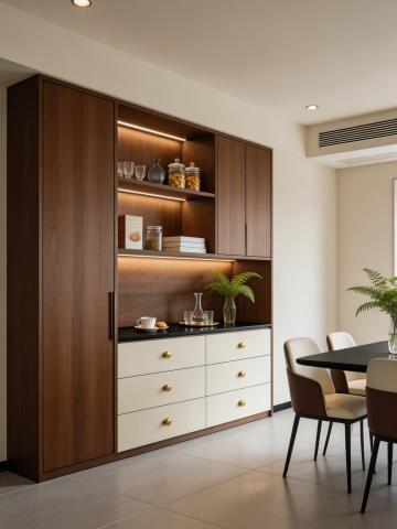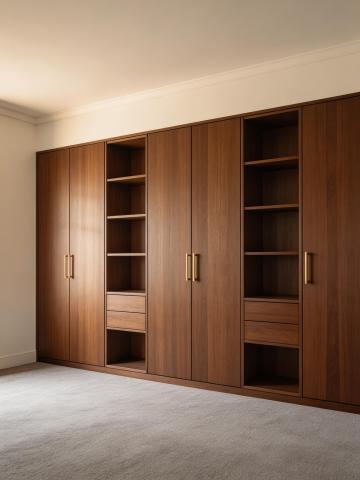 超写实室内家居商业实拍照片,8K 超清分辨率,极致真实的摄影级质感,侧视平视斜角构图,轻微自然透视无畸变,焦点清晰锁定整体一体式通顶衣柜,自然适中景深,画面干净整洁无多余杂物,主体突出,呈现现代中古风融合轻法式轻奢的卧室一体式通顶衣柜家居场景,整体空间为静谧舒适的现代卧室,画面左侧露出配套的卧室睡眠区,还原真实居家场景;主体为顶天立地的一体式平开门定制衣柜,整体采用带有细腻自然纹理的深胡桃木哑光木饰面,无反光高光,柜体采用五扇极简平板平开门设计,门板带有极窄同色边框,门缝均匀极细,一门到顶无上下多余收口条,与顶面地面完美贴合,风格极简高级;衣柜下方左侧区域设置 2 列并排的奶白色哑光烤漆平板抽屉,每列 2 个共 4 个抽屉,每个抽屉正中均安装一枚圆形哑光黄铜金属拉手,与整体轻奢风格完美统一,细节质感拉满;画面左侧露出配套的卧室睡眠区,带有浅咖色亲肤软包床头的双人床,铺有米白色柔软床品,搭配同木色的悬空床头柜,床头柜上摆放透明玻璃花瓶、花艺与白色杯碟,床头上方垂吊一盏现代简约床头吊灯,灯杆为哑光金色,搭配奶白色圆润灯罩,暖光柔和,与整体风格呼应;地面通铺大尺寸浅灰色哑光瓷砖,采用同色系美缝处理,瓷砖缝隙极细,整体感极强,地面带有柔和自然的光影反射,还原真实地面质感;顶面为极简平顶设计,无主灯布局,顶面为暖白色哑光乳胶漆,空间阴角线条干净利落,无多余装饰,卧室背景墙面为暖白色哑光乳胶漆,床头区域搭配同色系木饰面与隐藏式氛围灯带,整体色调和谐统一;整体采用柔和的暖调自然光,搭配卧室隐藏灯带与床头吊灯的暖光氛围照明,光影过渡自然柔和,明暗层次丰富,无生硬死黑阴影,整体色彩色调为低饱和度暖色系,以深胡桃木暖棕色为基底,搭配奶白色、浅咖色、米白色,以哑光黄铜金色作为轻奢点缀,色彩和谐统一,高级感拉满,画面极致还原真实材质质感,木饰面的自然细腻纹理、金属的哑光细腻质感、烤漆的温润质感、软包的柔软亲肤质感、布料的自然肌理、玻璃陶瓷的通透质感都精准呈现,整体氛围温馨静谧,简约高级,舒适治愈,兼具强大储物功能与美观性的现代卧室家居空间。